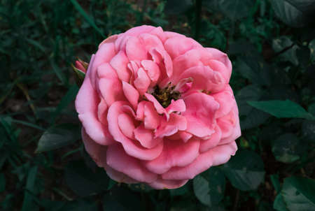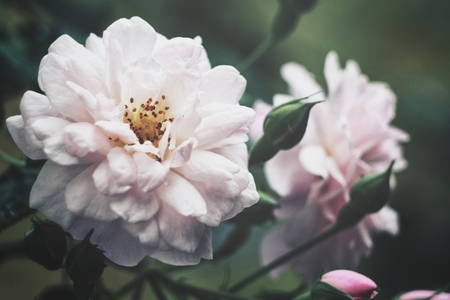 pretty and opulent baby pink rose in bloom with bud and dark green background