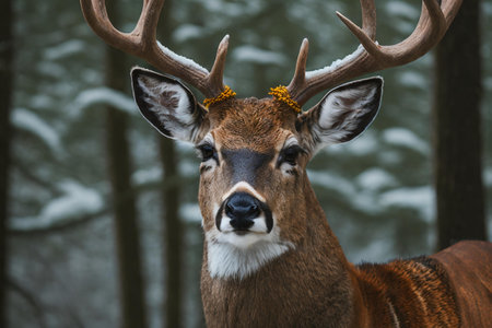 a majestic stag standing tall and proud in a snowy forest.