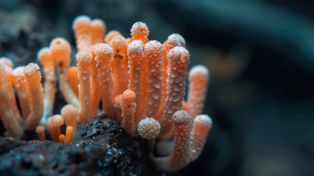 A cluster of vibrant orange coral fungi, covered in tiny white droplets, grows out of a dark, textured forest floor. The fungi's delicate, slender stalks are arranged in a dense, circular formation, creating a striking visual contrast against the dark background.