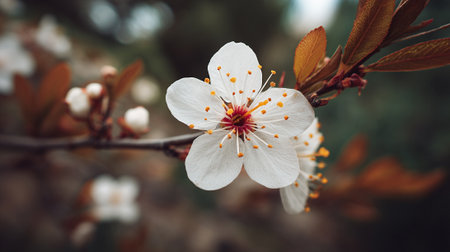 Captivating close-up of pristine white plum blossom amidst autumn leaves
