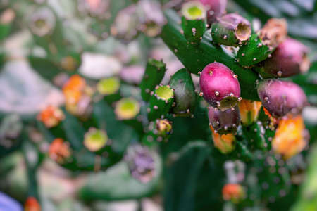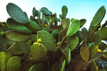 Cactus Opuntia ficus with fruits. Prickly Pear or Indian fig or mission Cactus. Nature wallpaper background.