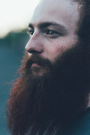 Close up portrait of gazing, bearded young male hipster