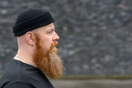 Profile view of a bearded redhead man wearing a beanie looking to copy space on grey with a serious thoughtful expression