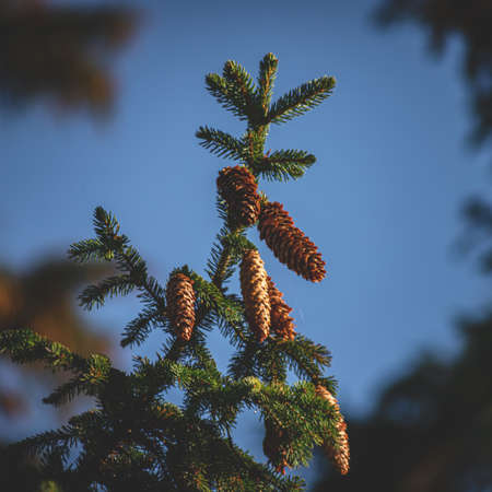 spruce tree branch with seed cones against blue sky