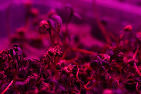Seeds sprouting in artificial light. Microgreens growing for healthy nutrition close up selective focus