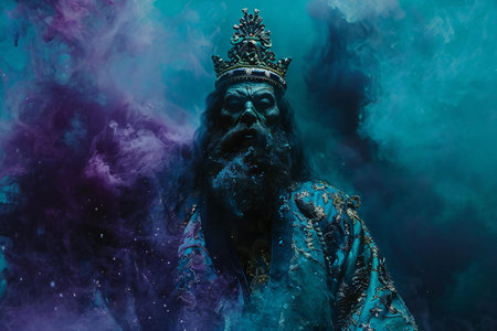 Portrait of the wise king in a blue smoke. Fantasy.