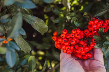Bush with lots of red berries on branches, autumnal background. Close-up colorful autumn wild bushes with red berries and cold green leaves in the park. Shallow depth of field