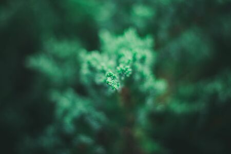 Natural and dark nature background of a green Thuja branch in low light conditions – Beautiful lush vegetation of a fir forest