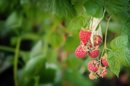 Closeup of growing organic raspberries. Ripe Raspberry in the fruit garden. Selective focus.