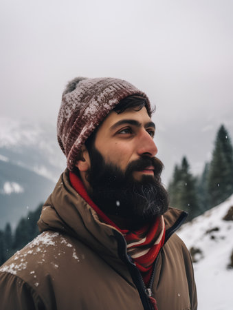 Handsome bearded man with long black beard and mustache in brown jacket and red hat on snowy mountain background