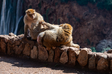 Wild monkey as Barbary Macaque sitting and grooming other monkey.