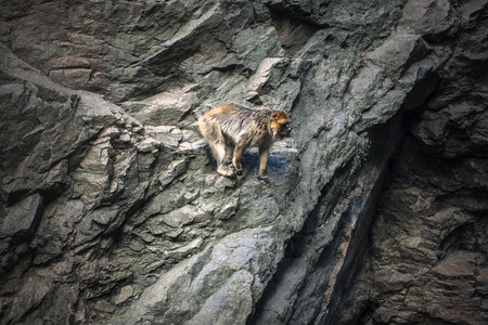 Mountain monkey in rocks. Wildlife hunters background with copy space