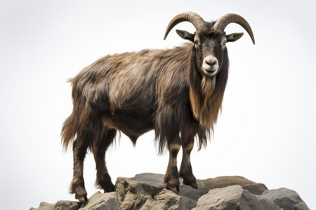 Majestic mountain goat stands proudly on rocky peak overlooking the ocean