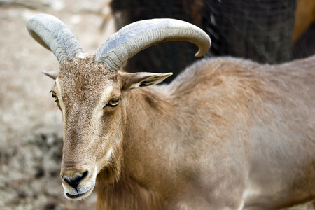 Barbary sheep closeup with large horns standing in Belgrade Zoo enclosure. Side view portrait
