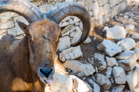 Beautiful mountain goat with helical long horns on the background of rocks.