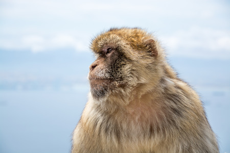 Gibraltar Barbary macaque monkey portrait with panorama view in background