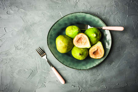 Organic fig tree fruits on the vintage plate on concrete background with copyspace