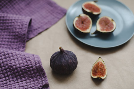 Ripe halves of figs in a plate and whole figs around on a light wooden table close-up. Healthy fresh vegan raw organic food