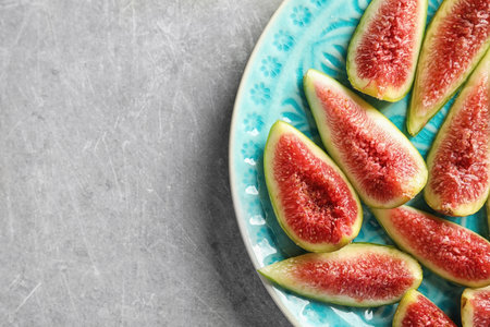Plate with fresh ripe fig slices on gray background, top view. Space for text