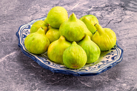 Fresh green figs in a plate on a marble background. Toned.