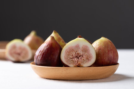 Fresh half fig and whole fruit on wooden plate with white and black background, Autumn fruit