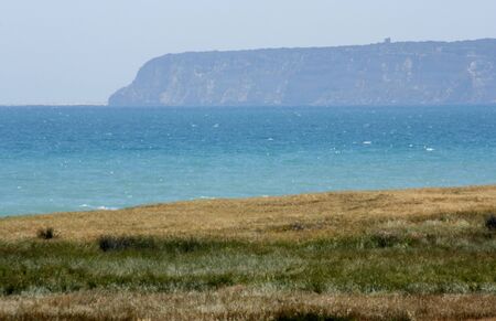 Crimea, Russia. The picturesque landscape of the Black Sea coast, known as Eltigen. Sandy seashore and rocky cliffs in the evening sunlight.
