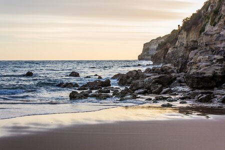 coastal cliffs by the ocean with waves. sunset