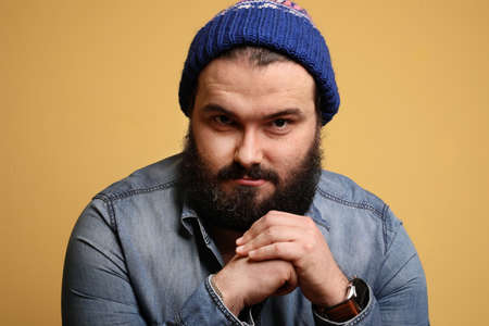 Portrait of handsome man with beard, posing over yellow background. Isolated.