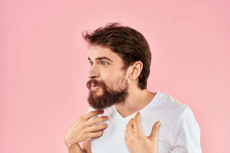 Man in white t-shirt gestures with hands emotions lifestyle cropped view pink background