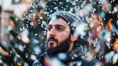 A man stands still as soft snowflakes fall around him capturing the spirit of Christmas with winter decorations in the background.