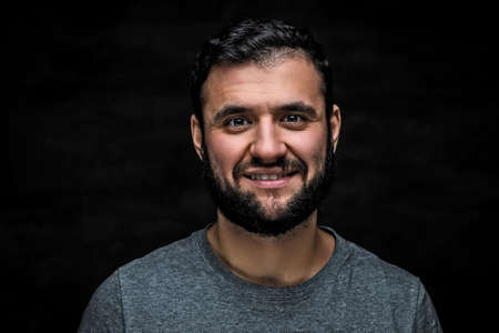 Close-up portrait of a cheerful bearded man, isolated on a dark background.