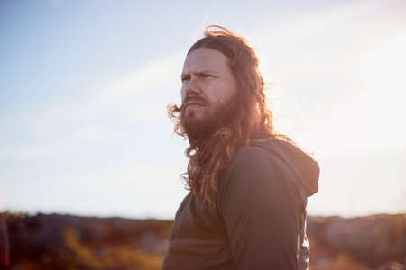Portrait of a young man with a beard looking into the distance