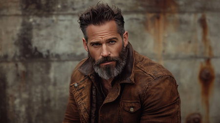 A rugged man with a full beard and messy textured hairstyle, standing against a rustic backdrop, embodying a casual and adventurous spirit
