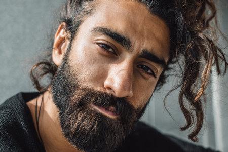 A man is in focus with a well groomed beard and hair. His expression is relaxed as he gazes towards the viewer. The background is soft and bright, creating a fresh look.