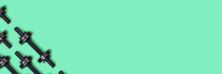 Sports web-banner. Dumbbell on mint green background. Flat lay, top view, copy space.