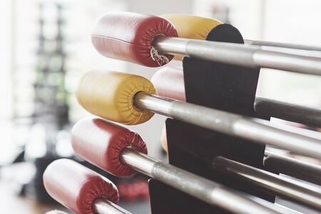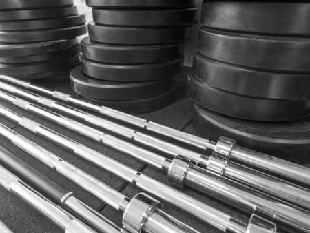 Gym equipment. Dark Gym with barbells on rack. Fitness workout center. Sport concept.
