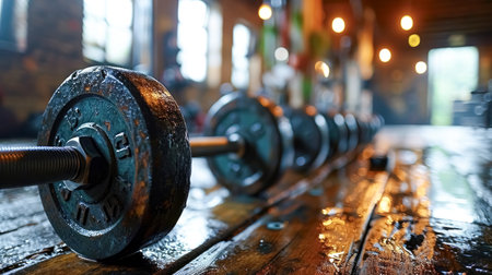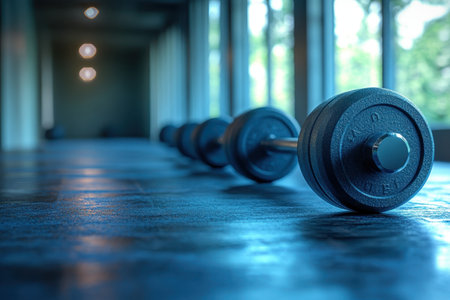 Dumbbells are positioned on a gym floor with natural light filtering in, showcasing a motivating atmosphere for fitness enthusiasts during morning workouts.
