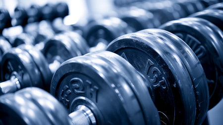 A detailed view of heavy dumbbells arranged in rows on a rack at a modern fitness gym, symbolizing strength training and workout routines.