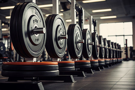 weight training, gym equipment or barbell set for fitness, workout or exercise at a health club, created with generative ai