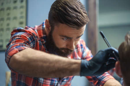 young barber shaving a beard of a customer in a barber shop - focus on the left eye