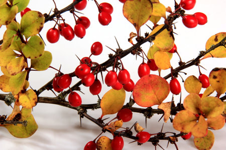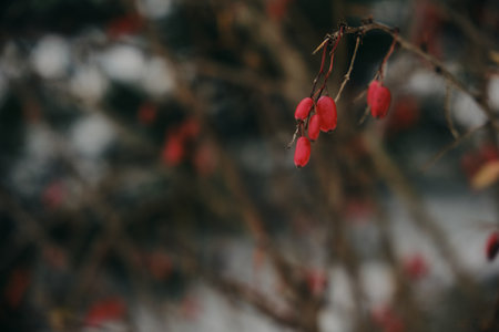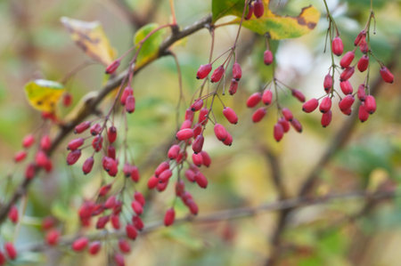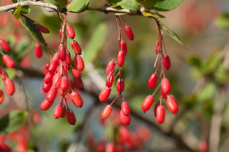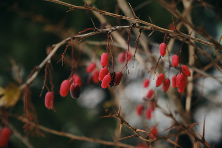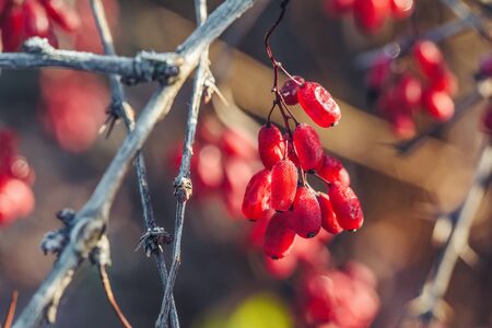 Berberis or Barberry shrub with ripe red berries on twigs.