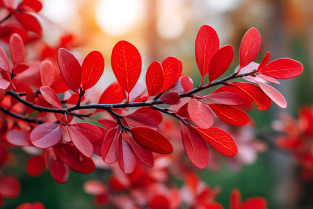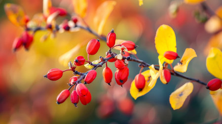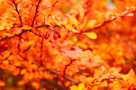 Branches of barberry with red leaves and red ripe fruits on an autumn day