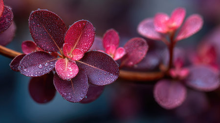 This close-up showcases a branch of colorful leaves, featuring shades of red and purple. Water droplets adorn the leaves, enhancing their texture against a blurred background. The image, with its soft focus and natural lighting, could be suitable for a variety of editorial or commercial purposes.
