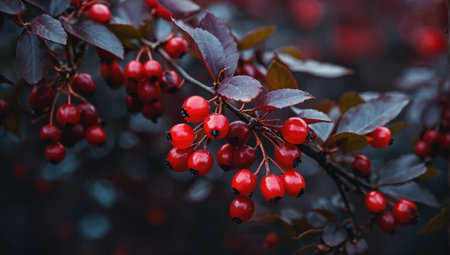 Small red berries on a branch in autumn. Soft selective focus and blurred background