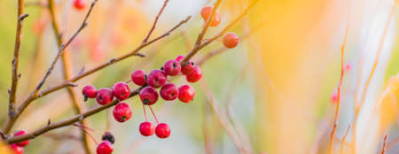 Beautiful panoramic autumn scenery with colorful leaves, berries and bokeh background