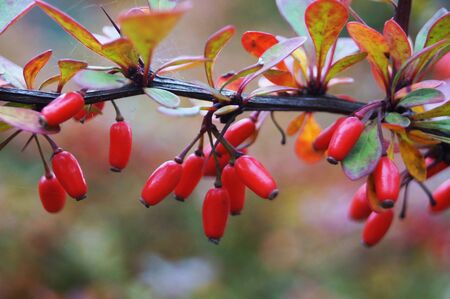 Close-up of Berberis thunbergii “Red thorch†with fruits in the garden. Barberry branch with red berries