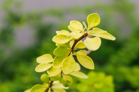 a barberry branch with water droplets on the leaves after a rain on a summer day in the garden