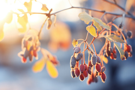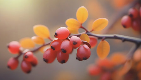 The berries of a barberry plant in the autumn sunshine, with a shallow depth of field