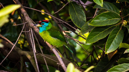 Crimson-fronted barbet (Psilopogon rubricapillus) bird, perfect camouflage with the banyan tree leaves.