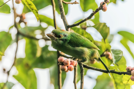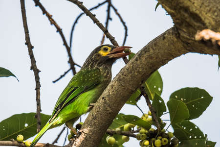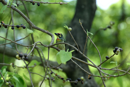 Great Barbet (Megalaima virens) bird eating fruit on tree